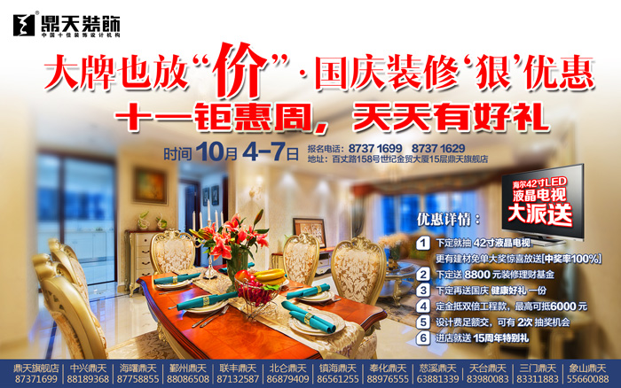 1.下定就抽42寸液晶電視,更有建材免單大獎(jiǎng)驚喜放送【中獎(jiǎng)率100%】; 2.下定就送8800元裝修理財(cái)基金一份; 3.下定再送國(guó)慶健康好禮一份; 4.定金抵雙倍抵工程款,最高可抵6000元; 5.設(shè)計(jì)費(fèi)足額交,可有2次抽獎(jiǎng)機(jī)會(huì); 6.進(jìn)店就送15周年特別禮1份; 時(shí)間:10月4日—7日 報(bào)名電話:87371699 地址:寧波百丈路158號(hào)世紀(jì)金貿(mào)大廈15層鼎天裝飾旗艦店