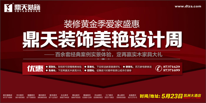 五月之美,始于綠意濃稠;五月裝修之美,始于美艷設計周,這黃金季的盛惠。在這綠色的時節(jié),鼎天裝飾設計師們已是迸發(fā)出最強烈的設計靈感,妝扮生活,為您打造愛家。5月23日,鼎天美艷設計周奉獻最豐盛的設計盛宴,最吸引人的優(yōu)惠大獎,問候五月,致敬綠色。地點:凱洲大酒店四樓嘉洲廳(天一廣場南面)。 設計:致敬專屬的生活 多年來,對裝修設計時尚元素的不斷整理、分析和提取,鼎天裝飾積累了深厚的設計創(chuàng)意功底。針對不同人群,鼎天裝飾設計了在商業(yè)快節(jié)奏里突顯溫情的慢調,專為都市白領打造的優(yōu)雅,滿足城市精英的個性和專屬別墅的華貴舒適等。在千余套不同小區(qū)、不同風格的室內設計臻品案例中,5月23日美艷設計周為您一一呈現(xiàn)。 針對高端別墅裝修的業(yè)主,鼎天裝飾通過自身強大的資源整合能力,以及領攜至尊工作室設計團隊推行別墅裝飾的整體規(guī)劃設計與施工、別墅設備、主材、家具、配飾的私屬定制一站式服務,在細節(jié)上做到極致,滿足高端消費者在居家裝修上的各種需求。如設計階段布局智能家居系統(tǒng),實現(xiàn)智能安防、新風、吸塵、凈水、溫控、娛樂等居家功能等,為您打造一站式健康舒適的專屬生活。 優(yōu)惠:整套實木餐桌等您贏取 美艷設計周,5重好禮樂享不盡:簽到禮、簽單禮、連購禮、免單禮及回饋禮輪翻上演。只要到訪活動,所有業(yè)主都可拿一份精美禮品;下定即送家居健康好禮,并憑鼎天裝飾定單,參與砸金蛋得免單大獎,除了建材、家電、工程抵用款等心動大獎,更有整套美式實木餐桌等您現(xiàn)場贏取,單單有獎,等您敲定。此外,活動還推出品牌建材聯(lián)盟大特惠,不僅有特價爆款,還享受連購禮,(根據連購的建材品類數量)免費收獲電飯煲、洗衣機等實用家電大禮。五月裝修強惠來襲,就在這一天了! 到訪業(yè)主還可參與“在裝工地體驗行”?;顒娱_通了百套實景樣板房直通車,讓業(yè)主們現(xiàn)場體驗不同風格、不同戶型、不同施工階段的裝修在建工地,聆聽設計師的設計講解,感受真實空間的設計元素布局。如:青林灣、海外灘、新外灘一號、銘豪觀樾、維科上院、鈺鼎園、蘇園、印象外灘、星河國際、舒沁苑、君和院、世貿首府、銀億東岸、風格尚品、盛世華府、金億文園、悅瀾灣、景瑞望府、君瀾上府、榮安心居、鉑翠灣、東海府、藏瓏、締壹城、君園和莊、山清軒、銀億上郡、文瀾水岸、左岸尚苑、金色江山、水榭花都、中海國際社區(qū)、紫玉花園、麗江苑、君雅苑、金色瓏庭、東都華庭、宜家花園、晴園、麗景英郡、保利城、芳辰麗陽、英倫水岸、東湖觀邸、盛世天城、江南一品、雍城世家、上上城等甬城小區(qū)由您選擇。如此細致,只為保障您的家裝在設計、工程上的品質。 專業(yè):整體家居方案 大眾之選 “好生活,好設計”,鼎天裝飾的裝修設計理念同樣致力于為大眾消費者打造精品之家,并以整體家居解決方案,滿足大眾裝修省心、省力、省錢的需求。目前,鼎天裝飾成功推出的美艷1號、美艷5號、美艷8號及美艷999等精裝套餐,已在市場上取得了巨大成功,深受都市白領、經典婚房及改善型裝修者的青睞。每套方案,鼎天裝飾都結合了全體設計師團隊的設計智慧,在裝修風格、價格、適宜人群等全面細化,并制定教課書般施工方案,由金牌施工團隊全力打造。因為實行有效地資源整合,據估算,精裝套餐整體家居還比常規(guī)裝修節(jié)省費用400-500元/平方米。 五月之美,開啟美艷設計周! 特別預告: 5月23日(周六)9:00---17:00,鼎天裝飾在凱洲大酒店四樓嘉洲廳(天一廣場南面)舉辦“美艷設計周”裝修黃金季愛家盛惠活動,現(xiàn)場限量征集前100套鼎天“美艷”樣板房,并以成本價為其裝修,且由鼎天至尊工作室、金牌施工團隊聯(lián)手打造完美家裝樣板工程。現(xiàn)場還尊享一站式家裝建材購齊服務,優(yōu)惠史無前例! 樣板房報名熱線:87371629 貴賓熱線:87371699