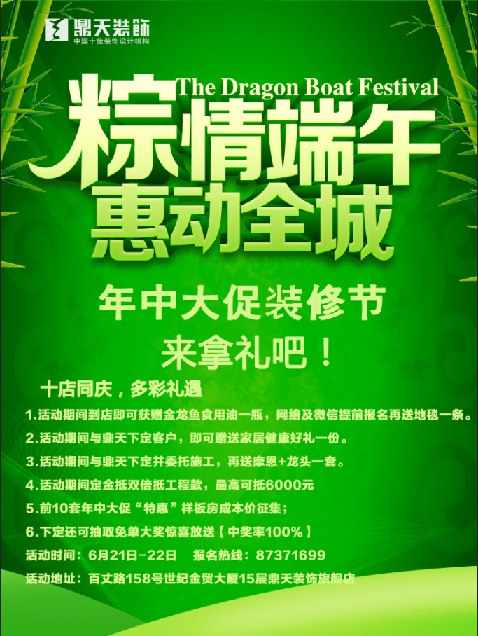 時(shí)間:6月21日—22日 報(bào)名電話:87371699 地址:寧波百丈路158號(hào)世紀(jì)金貿(mào)大廈15層鼎天裝飾旗艦店