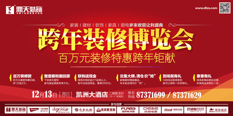 “快樂疊加,就變成了超級快樂。新房裝修,一件全家人都快樂的事,遇上新年、休假、親戚聚餐等諸多樂事,于是收獲了超級快樂。這個時間段的裝修,我們叫它跨年裝修。鼎天裝飾跨年裝修博覽會,即將為跨年裝修添加更多激動人心的愉快元素:百萬元的跨年裝修特惠、攜手一線品牌建材抄底收官等,12月13日,讓裝修超級快樂! 大手筆:存1萬抵2萬,百萬裝修特惠鉅獻 12月13日,在跨年裝修博覽會上,享預存定金超值優(yōu)惠,最高存1萬抵2萬元工程款,并且當天下定,此優(yōu)惠可保留至年后裝修。業(yè)主既可以享受到年底裝修收官特惠,還將有利避免年后材料、人工費漲價行情。 此外,活動中還有眾多一線建材品牌,推出聯(lián)盟建材年底收官讓利。年底建材驚爆價,加現(xiàn)金返還讓利,讓活動“惠上加惠”?,F(xiàn)場選購2個建材品類及以上,即最高返還2000元現(xiàn)金。活動中品牌建材聯(lián)盟涵蓋瓷磚、地板、櫥柜、吊頂、軟飾、家具、廚電等眾多品類。12月13日,百萬裝修特惠,大惠全城。其次,活動當天與鼎天裝飾下定還可參與砸金蛋贏免單大獎,最高可贏整套櫥柜搬回家。 活動中,鼎天裝飾不僅安排了豪華設計師陣容,由鼎天至尊工作室設計團隊坐鎮(zhèn),并推出“在裝工地體驗”活動,開通百套實景樣板房直通車,讓業(yè)主們現(xiàn)場體驗不同風格、不同戶型、不同施工階段的裝修,聆聽設計師的設計講解,感受真實空間的設計元素布局。 業(yè)主可參觀青林灣、寰宇天下、東海府、濱江府、景瑞上府、羅蒙環(huán)球城、鉑翠灣、東方一品、東海府、天境花園、海外灘、新外灘一號、中海國際社區(qū)、銘豪觀樾、維科上院、鈺鼎園、蘇園、印象外灘、星河國際、舒沁苑、樂筑良品、君和院、銀億東岸、風格尚品、盛世華府、金億文園、悅瀾灣、景瑞望府、君瀾上府、榮安心居、藏瓏、締壹城、君園和莊、山清軒、銀億上郡、文瀾水岸、左岸尚苑、金色江山、水榭花都、紫玉花園、麗江苑、君雅苑、金色瓏庭、東都華庭、宜家花園、晴園、麗景英郡、保利城、芳辰麗陽、英倫水岸、東湖觀邸、盛世天城、江南一品、雍城世家、上上城等甬城名小區(qū)。 大品牌:品質不打烊,大牌來保駕 鼎天裝飾是有16年歷史的甬城本地品牌,是寧波裝飾行業(yè)率先獲得知名商標企業(yè)稱號的裝飾公司。2015年,鼎天裝飾再獲諸多榮譽,用品牌口碑保跨年裝修品質。 2015年浙江省優(yōu)秀建筑裝飾工程獎(住宅類)公布,鼎天裝飾在羅曼風情小區(qū)的住宅工程被評為“2015年浙江省優(yōu)秀建筑裝飾(住宅)工程”項目。 2015年,鼎天裝飾工程部精英團隊在“寧波市裝飾行業(yè)職業(yè)技能大賽”中奪得第一名,并代表寧波市裝飾行業(yè)參加浙江省職業(yè)技能競賽。 大實用:整體家居,“三省”裝修 鼎天裝飾打造整體家居解決方案,滿足大眾裝修省心、省力、省錢的“三省”裝修需求。其優(yōu)勢在于,方案借鑒大量優(yōu)秀裝修案例,用團隊的智慧洞悉人們的日常生活,最大化確保居住的舒適性和功能使用的合理性。目前,鼎天裝飾成功推出的美艷1號、美艷5號、美艷8號及美艷999等精裝套餐,已在市場上取得了巨大成功,深受都市白領、經典婚房及改善型裝修者的青睞。在有效地資源整合下,鼎天整體家居方案比常規(guī)裝修能節(jié)省費用400-500元/平方米。 特別預告:12月13日(周日)9:00---17:00,鼎天裝飾在凱洲大酒店二樓聚龍軒(天一廣場南面)舉辦“跨年裝修博覽會”,現(xiàn)場限量征集200套“跨年施工”樣板房,百萬裝修特惠鉅獻,且由鼎天至尊工作室、金牌施工團隊聯(lián)手打造完美家裝樣板工程?,F(xiàn)場還尊享一站式家裝建材購齊服務,高達萬元的種種福利,不敢私藏!樣板房報名熱線:87371629 貴賓熱線:87371699
