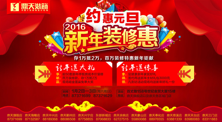 新春總有各種驚喜,新家裝修同樣有驚喜!1月2日—3日(周六/周日),鼎天裝飾2016新年裝修“惠”,大牌任性送禮,要裝修的您趕緊開搶! 新年裝修主要看:優(yōu)惠 1月2日—3日(周六/周日),鼎天裝飾各門店將舉辦“2016新年裝修“惠”活動,現(xiàn)場任性送禮。為迎新答謝,鼎天裝飾向全甬城待裝修客戶發(fā)出50套新年樣板房征集令,以成本價為其裝修;當日下單, 2016年裝修享2015年的裝修基礎材料價格和人工費,新舊交替,讓您的裝修成本不漲價,名額僅限前50戶。其次,還享預存定金超值優(yōu)惠,最高存1萬抵2萬元工程款。“任性”就此結束?還沒呢,下單客戶還能再享3000元新年主材禮包,這3000元可以購買,瓷磚、地板、櫥柜、窗簾等。活動中,還有眾多新年新大禮奉上。裝修特惠駕到,您到了嗎? 此次活動鼎天裝飾將在寧波城區(qū)、北侖、奉化、余姚、慈溪、天臺、三門、象山等十六店同慶。 新房裝修主要看:品質 這場新年裝修“惠”,鼎天裝飾不光送上大禮,還要送上品質,送上貼心服務?;顒又校μ煅b飾攜“至尊工作室”豪華設計師陣容亮相,并推出“在裝工地體驗”活動。開通百套實景樣板房直通車,讓業(yè)主們現(xiàn)場體驗不同風格、不同戶型、不同施工階段的裝修,聆聽設計師的設計講解,感受真實空間的設計元素布局。這樣的實力,絕對保障您的家裝在設計、工程上的品質。 現(xiàn)場,業(yè)主們還可品鑒鼎天裝飾在諸多知名小區(qū)中打造的數(shù)千套優(yōu)秀案例,如青林灣、寰宇天下、東海府、濱江府、景瑞上府、羅蒙環(huán)球城、鉑翠灣、東方一品、天境花園、海外灘、新外灘一號、中海國際社區(qū)、銘豪觀樾、維科上院、鈺鼎園、蘇園、印象外灘、星河國際、舒沁苑、樂筑良品、君和院、銀億東岸、風格尚品、盛世華府、金億文園、悅瀾灣、景瑞望府、君瀾上府、榮安心居、藏瓏、締壹城、君園和莊、山清軒、銀億上郡、文瀾水岸、左岸尚苑、金色江山、水榭花都、紫玉花園、麗江苑、君雅苑、金色瓏庭、東都華庭、宜家花園、晴園、麗景英郡、保利城、芳辰麗陽、英倫水岸、東湖觀邸、盛世天城、江南一品、雍城世家、上上城等甬城名小區(qū)。大牌就是這么有底氣! 同時,還有鼎天美艷5號、美艷8號、美艷1號、美艷999精裝套餐作品,也將聯(lián)袂為您送上新春祝?!铝轲菢I(yè)主打造省錢、省心、省力裝修! 特別預告: 1月2日—3日(周六/周日),鼎天裝飾在各門店舉辦“2016新年裝修“惠”活動,現(xiàn)場限量征集前50套“新年特惠”樣板房,以成本價為其裝修!既可享受新年裝修特惠,還將避免年后材料、人工費漲價行情,且由鼎天至尊工作室、金牌施工團隊聯(lián)手打造完美家裝樣板工程。 樣板房報名熱線:87371629 貴賓熱線:87371699 |