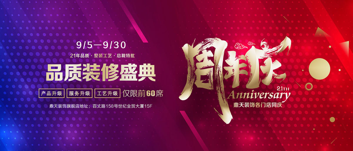 特別預(yù)告:9月5日—9月30日,鼎天裝飾【21周年慶】活動在鼎天各大門店舉辦,活動期間到店既享好禮。21年品質(zhì)●墅裝工藝●八大福利,鼎天至尊工作室、金牌施工團隊聯(lián)手打造五星級樣板工程。