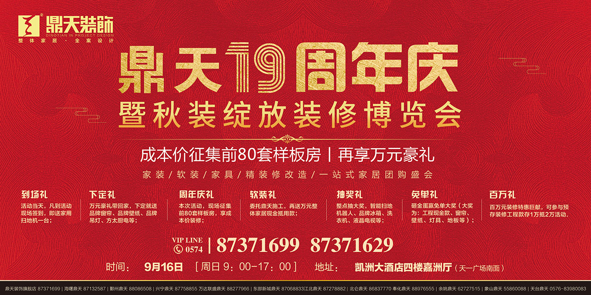 9月,鼎天裝飾的19周年。這場周年慶,我們不打算低調(diào)。9月16日,秋“裝”綻放,鼎天裝飾獨屬的19周年慶裝修博覽會,在凱洲大酒店四樓嘉洲廳,為您帶來獨屬的裝修盛惠。19年的深度服務,時間驗證下的品牌實力,這個周末,釋放對生活空間的全部想像,讓鼎天裝飾為您設計、為您打造愛家。 19周年禮,像秋天的豐收 周年慶,我們準備了不少禮物:超低價換購樣板房家具;送萬元整體家居、軟裝現(xiàn)金抵用款;現(xiàn)場下定,送窗簾、送墻紙、送吊燈、送方太廚電等。豐盛的各色禮物,希望您有一個甜美的秋季和裝修體驗。 此外,參加本次活動,可預存裝修工程款,存1萬抵2萬。現(xiàn)場下定,整點抽大獎:循環(huán)抽智能掃地機器人、品牌冰箱、洗衣機、液晶電視等;還能砸金蛋贏免單大獎,即享工程現(xiàn)金款、燈具、地板等。百萬元周年慶裝修特惠,秋季獨享,耀眼9月。 19年,用心一如既往 在19年里,我們見證了:裝修客戶們從對裝修的懵懂,到開始在裝修中,融入自己的思考和對生活的態(tài)度;而我們則從引導的角色,轉(zhuǎn)變?yōu)闈M足客戶需求,實現(xiàn)客戶構(gòu)想的輔助師。這么多年,鼎天用更好的材料,更優(yōu)秀的工藝,更潮流的設計,用實在品質(zhì)不斷贏取客戶的認同。今年,鼎天裝飾榮獲了“寧波市第七屆十大家裝品牌企業(yè)”。 此次活動,鼎天裝飾集聚雄厚的設計師和施工團隊,為您深度服務。業(yè)主們還能現(xiàn)場品鑒江灣城、銀泰城、蓮橋府、金茂悅、緹香郡、尚雅府、雅旭花苑、風格首岸、保利印江南、中梁壹號院、奧體未來城、金地悅江來、宏泰風花樹、公園1872、公園世家、奧萊公園、江山萬里、雅戈爾明洲、風格尚品、維科馨院、碧玥府、印象湖濱,紅星國際廣場、紅星豐璟苑、締壹城三期等眾多小區(qū)的裝修實例;同時,實地參觀在建工地,深入工地現(xiàn)場了解施工品質(zhì)。 針對客戶對個性裝修的審美需求,鼎天裝飾的高端別墅裝修團隊,特別提供集整體規(guī)劃設計與施工、別墅設備、主材、家具、配飾等私屬定制于一體的服務。 整體家居服務,一站式享受 追求個性,也需求便利,這是現(xiàn)在業(yè)主對裝修的主流想法。鼎天裝飾從開發(fā)第一款美艷1號產(chǎn)品,到推出美艷5號、美艷8號、美艷999,及“科技美宅”美艷9號等系列套餐,從整裝服務,集時尚個性和省心省力,不斷滿足客戶需求。 現(xiàn)在,鼎天美艷套餐已成為都市白領、經(jīng)典婚房、大平層及改善型裝修業(yè)主的首選,在有效整合裝修資源、流程和時間下,更是比常規(guī)裝修節(jié)省費用400-500元/平方米。裝修變得簡單卻不失精致。 鼎天裝飾深化自己的整體家居服務,已實現(xiàn)硬軟裝的無縫銜接。旗下的軟裝體驗館,提供整體家具、軟裝定制等服務。給予客戶更貼合及審美的產(chǎn)品。鼎天裝飾也晉升為首批浙江省住宅全裝修產(chǎn)業(yè)鏈示范企業(yè),已參與了金茂府、歡樂海岸、萬科東望、玖著里、廣源里、桂語里、東晟府、榮安香園等高端精裝修樓盤后期的精裝修改造及整體家居、軟裝定制服務。 而隨著精裝修房的普及,鼎天裝飾又及時推出精裝修房微改造服務,為精裝修房業(yè)主提供住宅空間的微調(diào)、微改,更細心地滿足客戶對家的小改動需求。 特別預告: 9月16日(周日)9:00-17:00,鼎天裝飾在凱洲大酒店四樓嘉洲廳(天一廣場南面)舉辦“19周年慶暨秋裝綻放裝修博覽會”,現(xiàn)場限量征集前80套成本價樣板房,且悅享百萬裝修特惠,并由鼎天至尊工作室、金牌施工團隊聯(lián)手打造完美家裝樣板工程?,F(xiàn)場還尊享一站式家裝建材購齊服務。種種福利,攻略9月裝修! 樣板房報名熱線:87371629 貴賓熱線:87371699