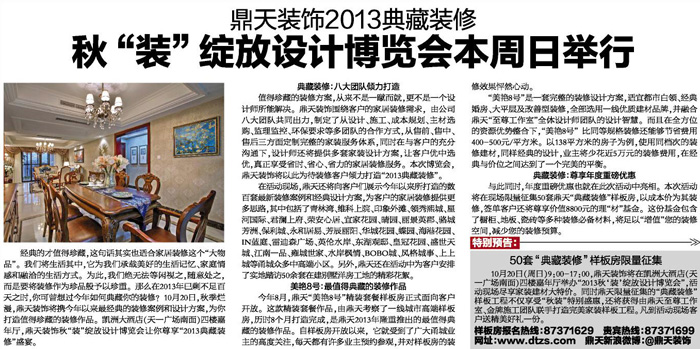 今年8月份,鼎天“美艷8號”精裝套餐樣板房正式面向客戶開放。這款精裝套餐作品,由鼎天考察了一線城市高端樣板房,歷時8個月打造完成,是鼎天2013年隆重推出的最值得典藏的裝修作品。自樣板房開放以來,它就受到了廣大甬城業(yè)主的高度關(guān)注,每天都有許多業(yè)主預(yù)約參觀,并對樣板房的裝修效果怦然心動。而這款經(jīng)典的作品,因全方位的資源整合優(yōu)勢,比同等規(guī)格裝修節(jié)省費(fèi)用400-500元/平方米。以138平方米的房子為例,使用同檔次的裝修建材,同樣經(jīng)典的設(shè)計,業(yè)主將少花近5萬元的裝修費(fèi)用,在經(jīng)典與價位之間達(dá)到了一個完美的平衡。 所謂經(jīng)典的才值得珍藏,這句話其實(shí)也完全適合家居裝修這個“空間藝術(shù)品”。所有業(yè)主都會希望自己的家居裝修空間也能是一個經(jīng)典,值得我們珍藏。那么在2013年已剩不足百天之時,你可曾想過今年如何典藏你的裝修?10月20日(本周日),秋季爛漫,鼎天裝飾將攜今年以來最經(jīng)典的裝修案例和設(shè)計方案,為你打造值得珍藏的裝修作品。凱洲大酒店(天一廣場南面)四樓嘉年廳,鼎天裝飾秋“裝”綻放設(shè)計博覽會讓你尊享“2013典藏裝修”盛宴。 圍繞客戶的家居裝修需求,鼎天裝飾八大團(tuán)隊共同出力,制定了從設(shè)計、施工、成本規(guī)劃、主材選購、監(jiān)理監(jiān)控、環(huán)保要求等多團(tuán)隊的合作方式,從售前、售中、售后三方面定制完整的家裝服務(wù)體系,同時在與客戶的充分溝通下,設(shè)計師還將提供多套家裝設(shè)計方案,讓客戶優(yōu)中選優(yōu),真正享受省時、省心、省力的家居裝修服務(wù)。本次博覽會,鼎天裝飾將以此為待裝修客戶傾力打造“2013典藏裝修”。 與此同時,年度重磅優(yōu)惠也就在此次活動中亮相,簽單客戶還將尊享價值8800元的理“材”基金。這份基金包含了櫥柜、地板、瓷磚等多種裝修必備材料,將足以“增值”您的裝修空間,減少您的裝修預(yù)算。 特別預(yù)告: 鼎天裝飾秋“裝”綻放設(shè)計博覽會 50套“典藏裝修”樣板房限量征集 10月 20日(周日)9:00---17:00,鼎天裝飾將在凱洲大酒店(天一廣場南面)四樓嘉年廳舉辦“2013秋‘裝’綻放設(shè)計博覽會”,活動現(xiàn)場盡享家裝建材大特價。同時鼎天“典藏裝修”樣板工程不僅享受“秋裝”特別盛惠,還將獲得由鼎天至尊工作室、金牌施工團(tuán)隊聯(lián)手打造完美家裝樣板工程。凡到活動現(xiàn)場客戶送精美好禮一份。 樣板房報名熱線:87371629 貴賓熱線:87371699 鼎天新浪微博:@鼎天裝飾 摘自2013年10月18日 寧波晚報 |
