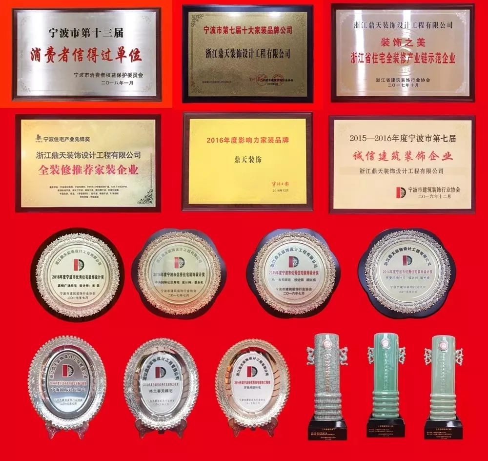 自鼎天裝飾1999年后成立以來,已連年獲得寧波市消費者信得過單位、年度影響力家裝品牌、誠信建筑裝飾企業(yè)、全裝修推薦裝飾企業(yè)等共計百余項獎項。 ▲鼎天榮譽區(qū)展示一角 鼎天裝飾一直以來秉持“誠實守信,客戶為先”的信念,已擁有深厚的品牌底蘊!鼎天在設(shè)計、施工、服務(wù)上更是追求極致,讓其在消費者心目中的形象與口碑極為良好。這讓鼎天裝飾成為裝飾行業(yè)的佼佼者,同時也獲得了消費者跟同行業(yè)的高度認可!