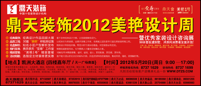 5月20 日(周日)9:00---17:00,鼎天裝飾將在凱洲大酒店(天一廣場(chǎng)南面)四樓嘉年廳舉辦鼎天裝飾2012美艷設(shè)計(jì)周和優(yōu)秀家裝設(shè)計(jì)咨詢展,到活動(dòng)現(xiàn)場(chǎng)盡享家裝建材大特價(jià)。