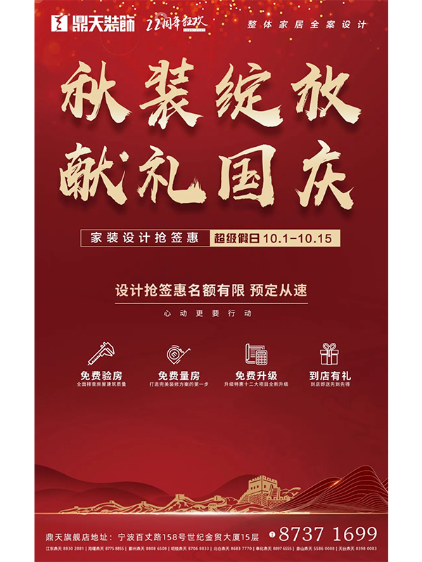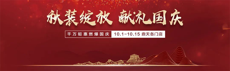 10月1日—10月15日鼎天超級(jí)假日《秋裝綻放·獻(xiàn)禮國(guó)慶》活動(dòng)熱烈,開(kāi)啟千萬(wàn)鉅惠●各種好禮等您來(lái)領(lǐng)詳情請(qǐng)咨詢以下各門店