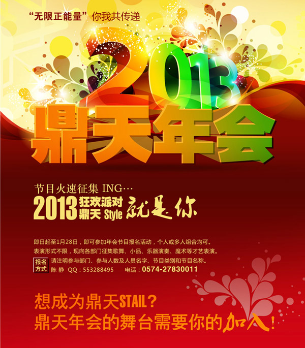 近日,“無限正能量”你我共傳遞鼎天2013年會節(jié)目征集活動正式開啟,自即日起至1月28日,凡鼎天集團(tuán)員工即可報名參加2013年會節(jié)目報名活動,盛大的年會舞臺期待著每一位鼎天人的身影!